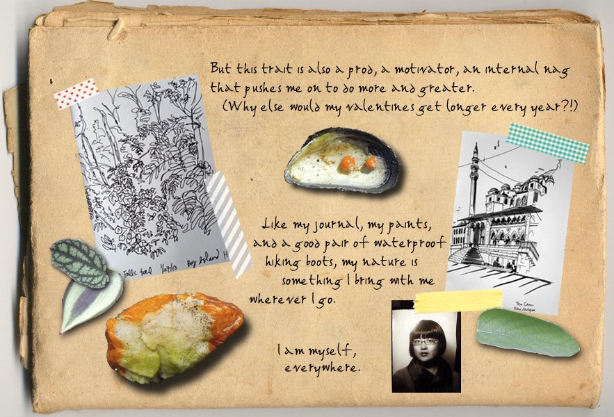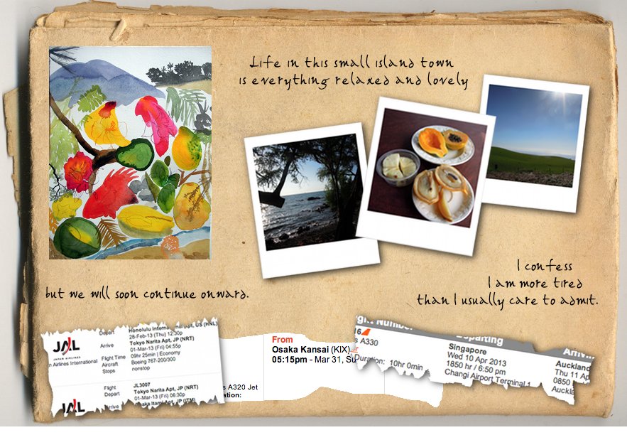 (washi tape -- hi Tamara!). As it took me so long to come up with the concept for this year's card, there is also a goofy, last-resort option I prepared in case I couldn't think of anything else. I thought of just deleting it, but maybe it'll make you smile. There's sound, but you can also watch it without. Page-by-page info, for the very curious: Page 1. The photos, from top to bottom, are from: Thingvellir in Iceland, Loch Linnhe in Scotland, and Istiklal Caddesi in Istanbul, Turkey; the menu clipping is from a Uighur restaurant in Istanbul, and the coin is Icelandic (its current value is about $0.78). The top portrait was painted just this week, and the bottom one in Edinburgh last July. Page 2. The photos are all from our current stay on the Big Island, and the painting was done two days ago. Yes, those are our flight confirmations for the next couple of months. Page 3. The photo was taken a few days ago when we went hiking on the Ala Kahakai Trail; we saw the leaves there too. The star-shaped thing is a cross-section of a star fruit, and the purple button was a fundraiser for a women's shelter in Reykjavík, Iceland. The airmail sticker is mandatory for foreign mail sent from the UK. Page 4. The leaves were from gardens or parks in Glasgow and Paris, though they're not necessarily native European plants. The shells and rock we found by the sea lochs of Scotland. The sketch on the left is from Akaka Falls on the Big Island, and the one on the right is of Yeni Cami (the so-called "New" Mosque, though it opened in 1665) in Istanbul. The B/W portrait is from a vintage photobooth in the Palais de Tokyo in Paris. |